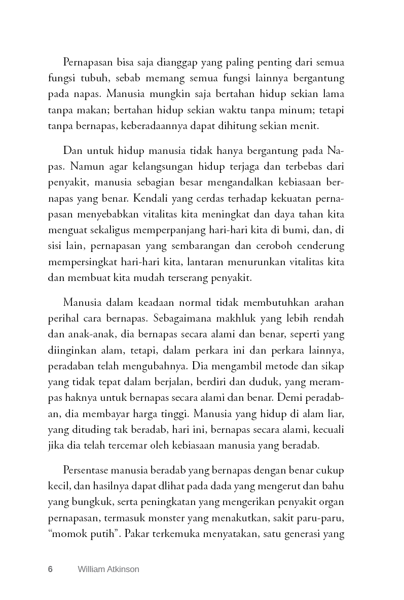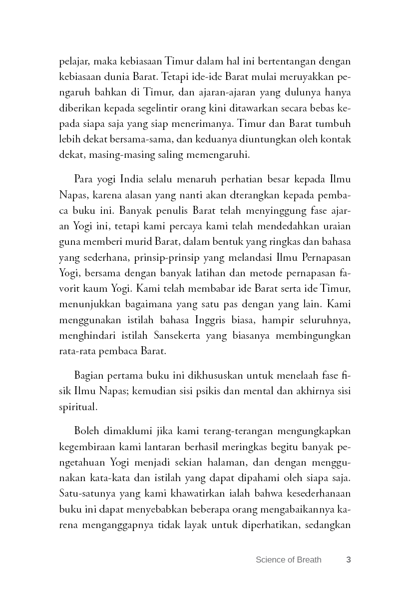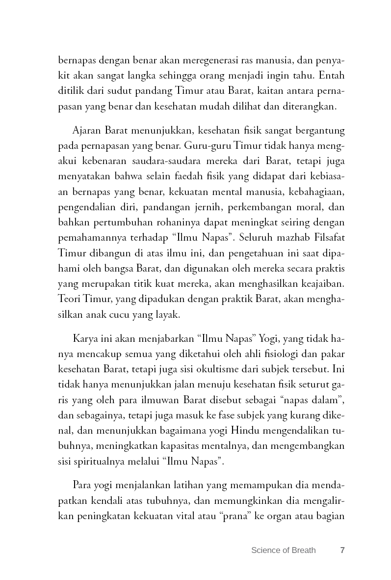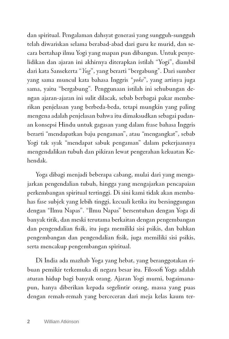 Di sini kami tidak akan membahas fase subjek yang lebih tinggi, kecuali ketika itu bersinggungan dengan “Ilmu Napas”. “Ilmu Napas” bersentuhan dengan Yoga di banyak titik, dan meski terutama berkaitan dengan pengembangan dan pengendalian fisik, itu juga memiliki sisi psikis, dan bahkan pengembangan dan pengendalian fisik, juga memiliki sisi psikis, serta mencakup pengembangan spiritual.