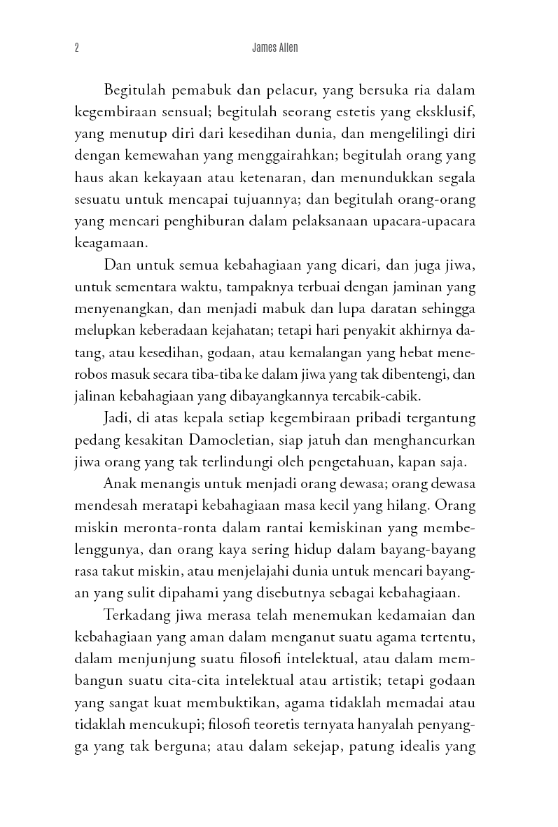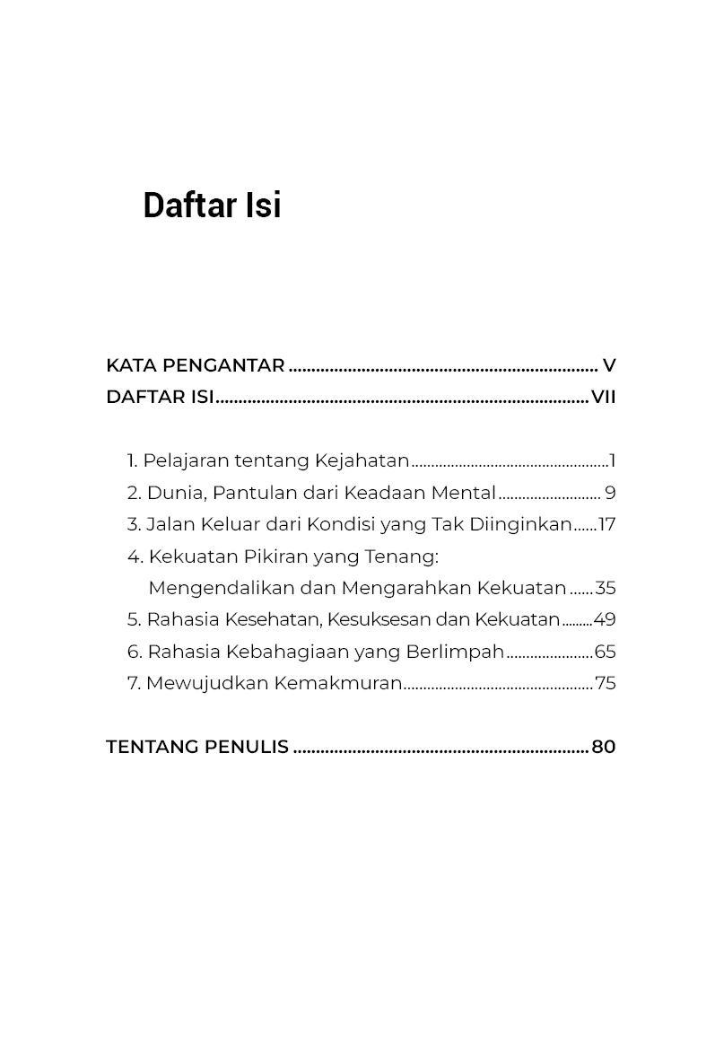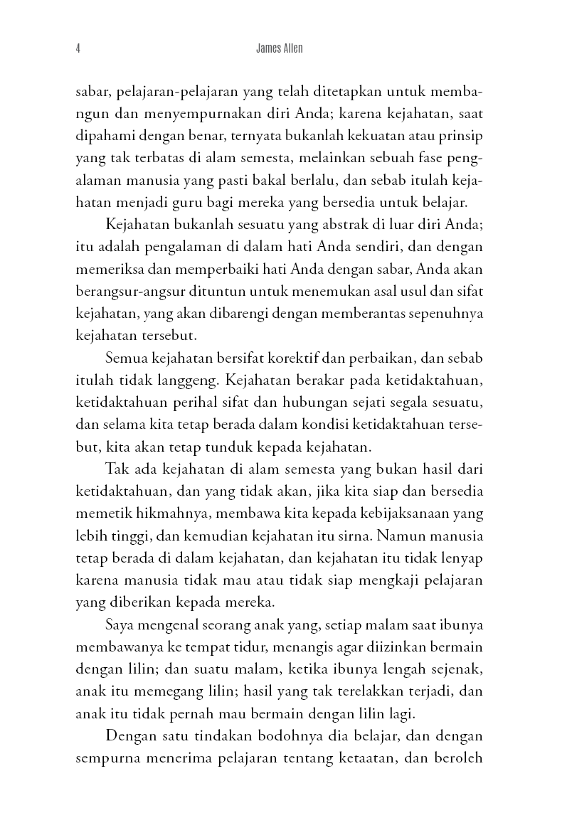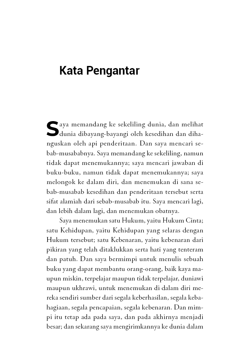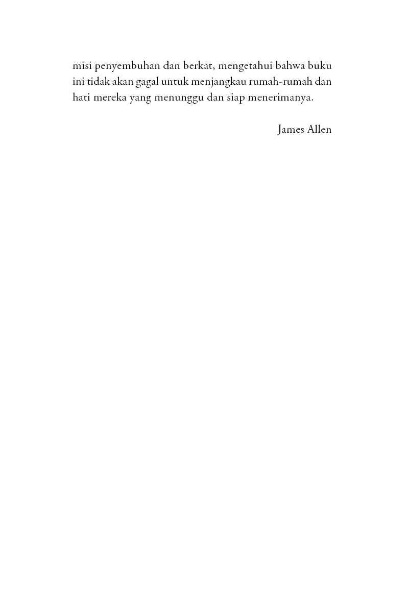 Saya menemukan satu Hukum, yaitu Hukum Cinta; satu Kehidupan, yaitu Kehidupan yang selaras dengan Hukum tersebut; satu Kebenaran, yaitu kebenaran dari pikiran yang telah ditaklukkan serta hati yang tenteram dan patuh. Dan saya bermimpi untuk menulis sebuah buku yang dapat membantu orang-orang, baik kaya maupun miskin, terpelajar maupun tidak terpelajar, duniawi maupun ukhrawi, untuk menemukan di dalam diri mereka sendiri sumber dari segala keberhasilan, segala kebahagiaan, segala pencapaian, segala kebenaran. Dan mimpi itu tetap ada pada saya, dan pada akhirnya menjadi besar; dan sekarang saya mengirimkannya ke dunia dalam misi penyembuhan dan berkat, mengetahui bahwa buku ini tidak akan gagal untuk menjangkau rumah-rumah dan hati mereka yang menunggu dan siap menerimanya.