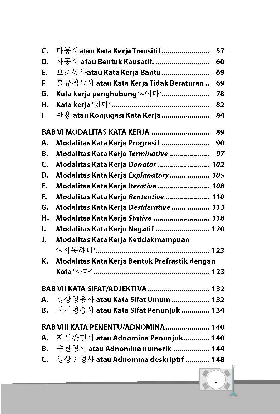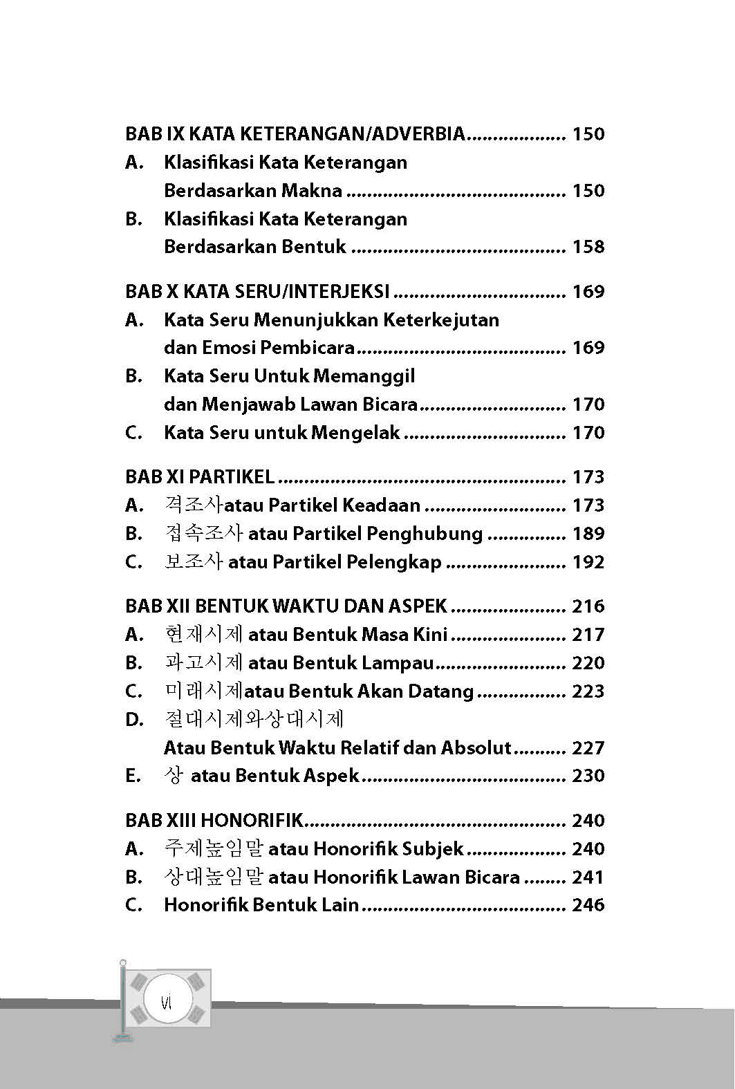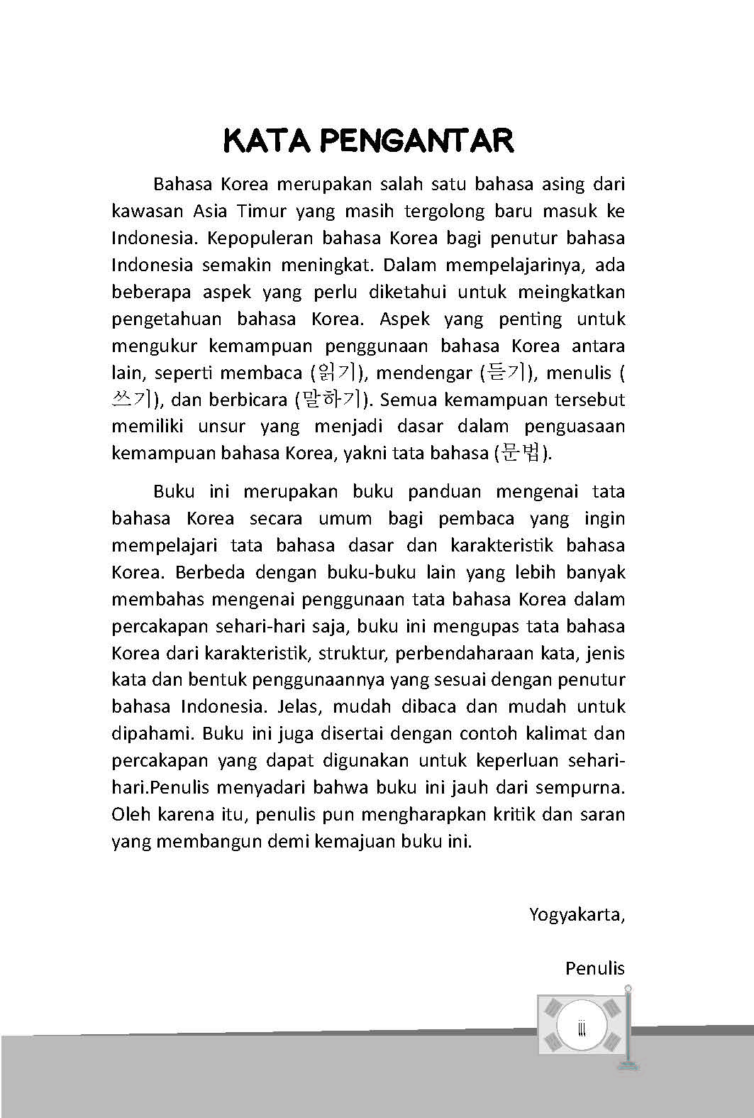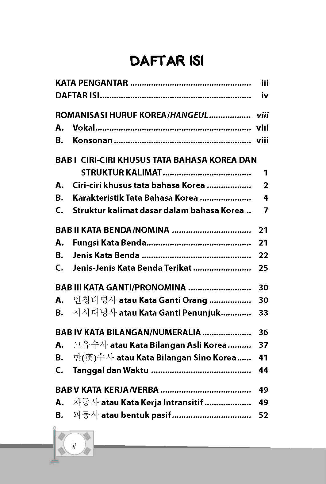 Buku ini berisi panduan tentang tata bahasa korea secara umum bagi pembaca yang ingin mempelajari tata bahasa dasar dan karakteristik bahasa korea. Perbendaharaan kata, jenis kata dan bentuk penggunaannya yang sesuai dengan penutur bahasa Indonesia. Buku ini juga disertai contoh kalimat dan percakapan yang dapat digunakan untuk keperluan sehari hari.