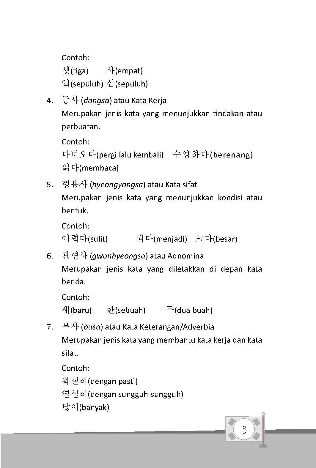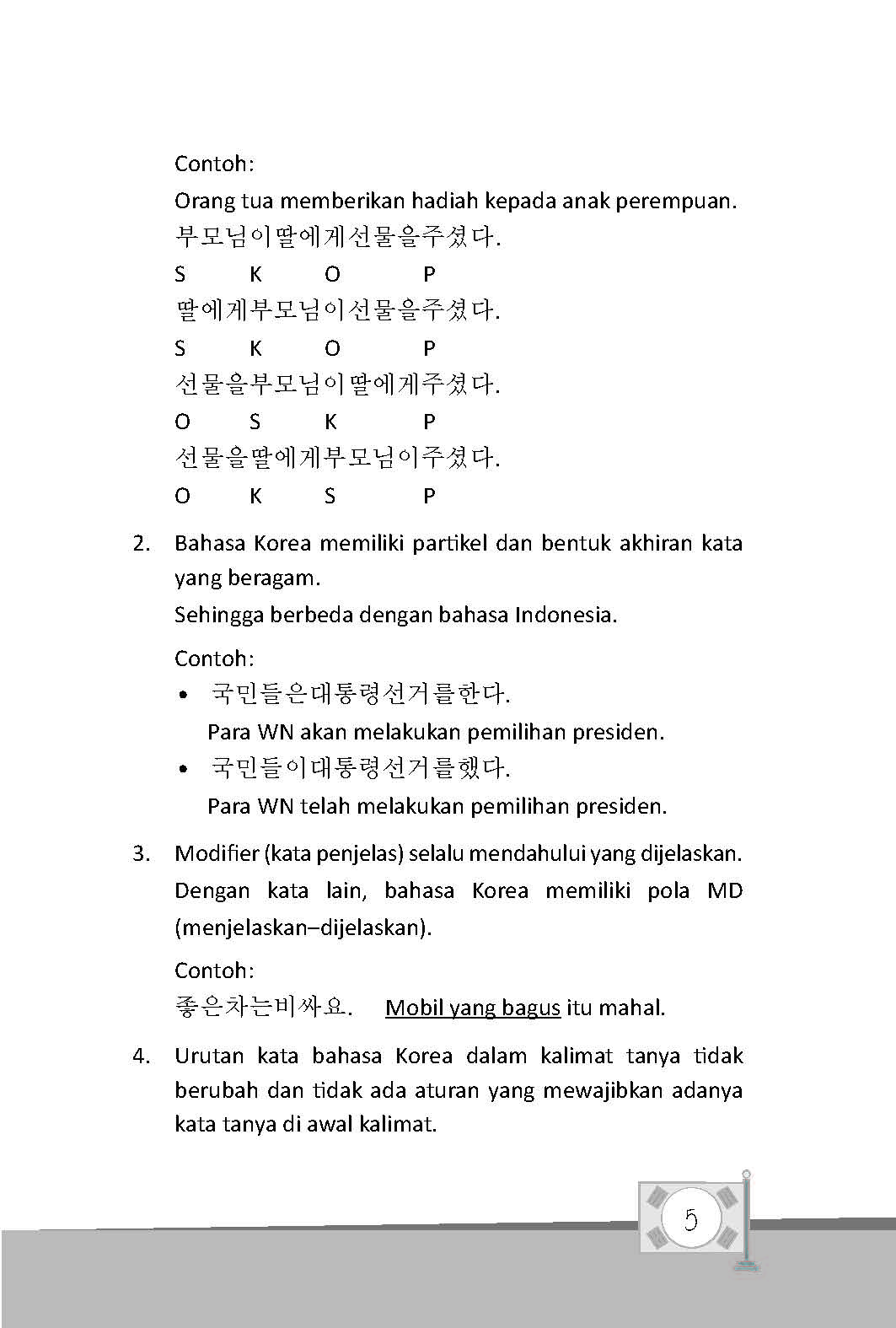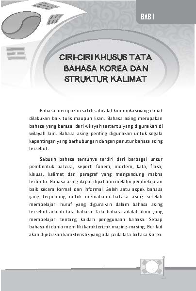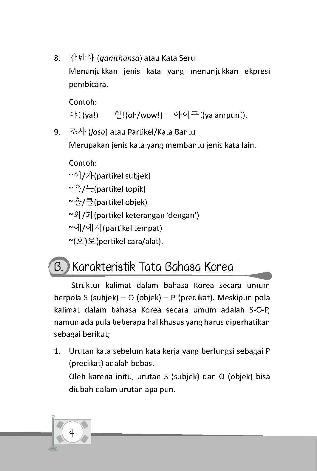 Buku ini berisi panduan tentang tata bahasa korea secara umum bagi pembaca yang ingin mempelajari tata bahasa dasar dan karakteristik bahasa korea. Perbendaharaan kata, jenis kata dan bentuk penggunaannya yang sesuai dengan penutur bahasa Indonesia. Buku ini juga disertai contoh kalimat dan percakapan yang dapat digunakan untuk keperluan sehari hari.