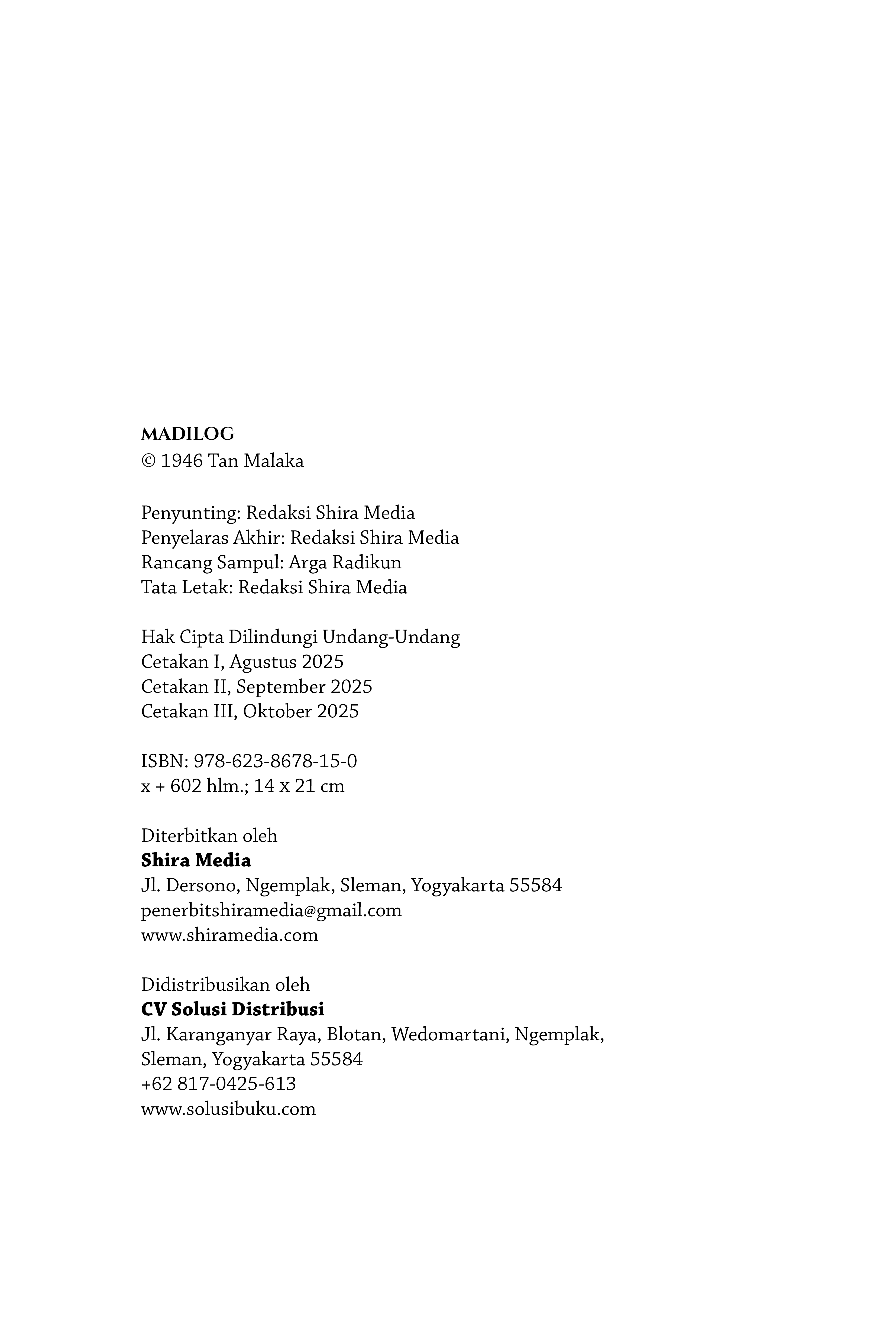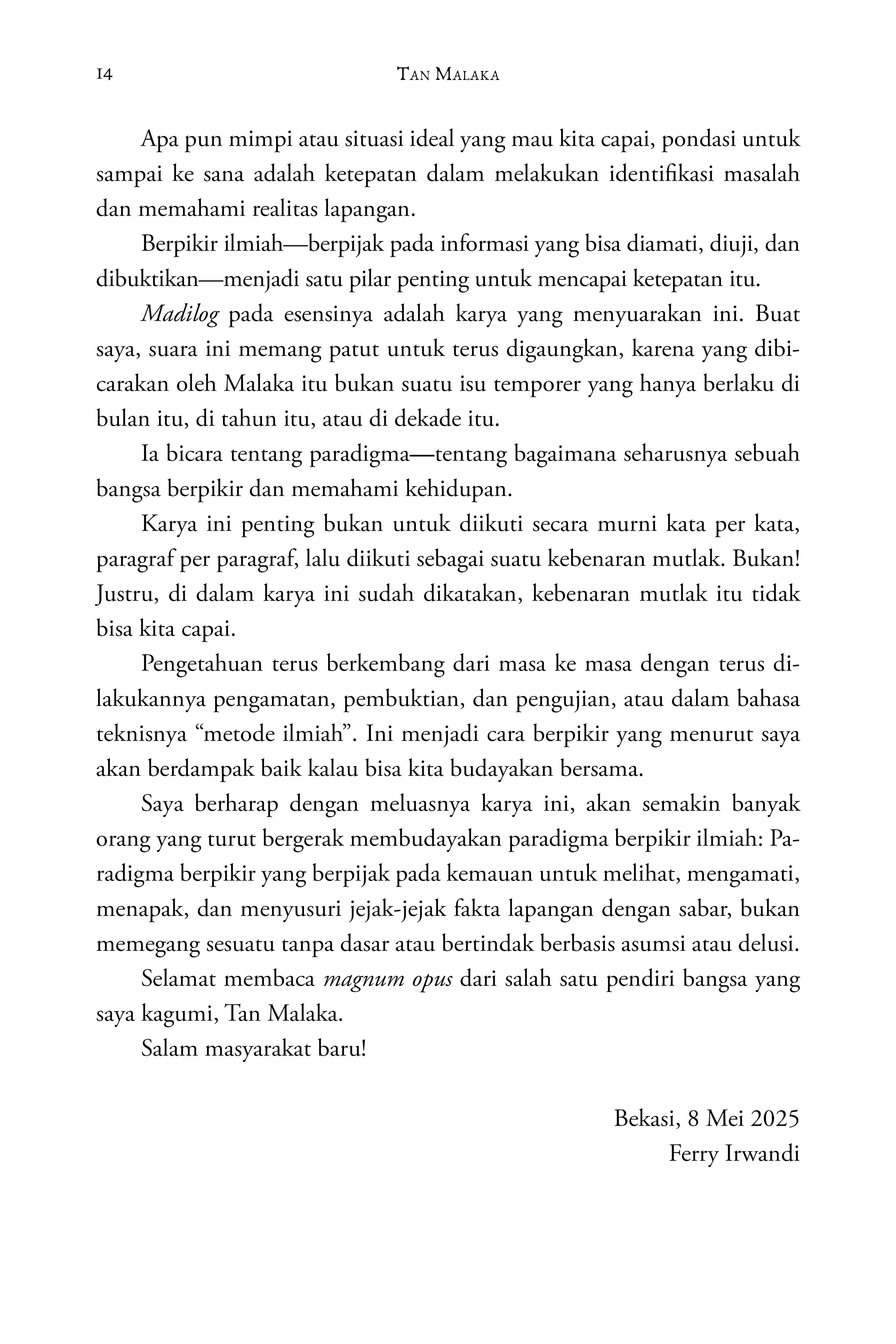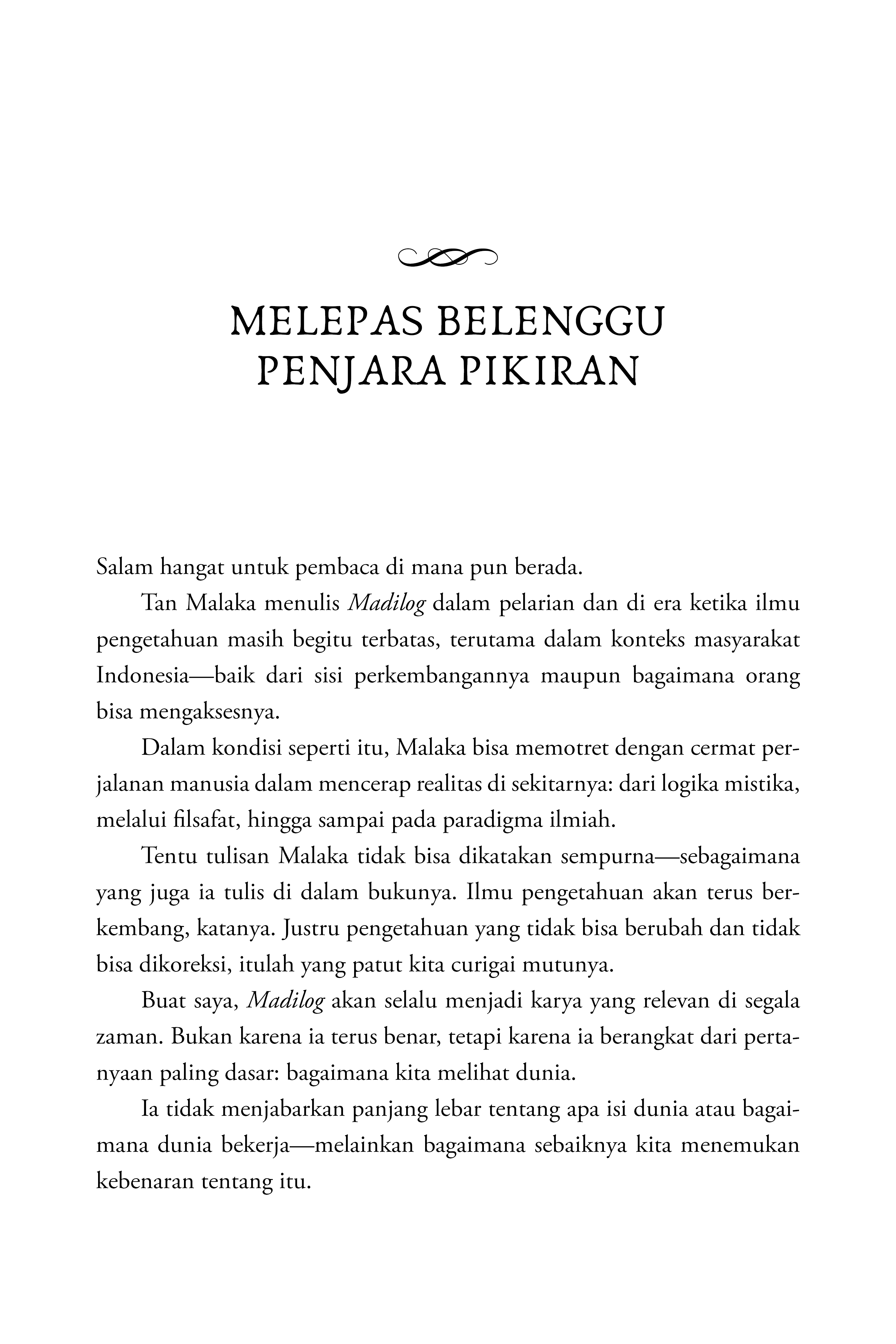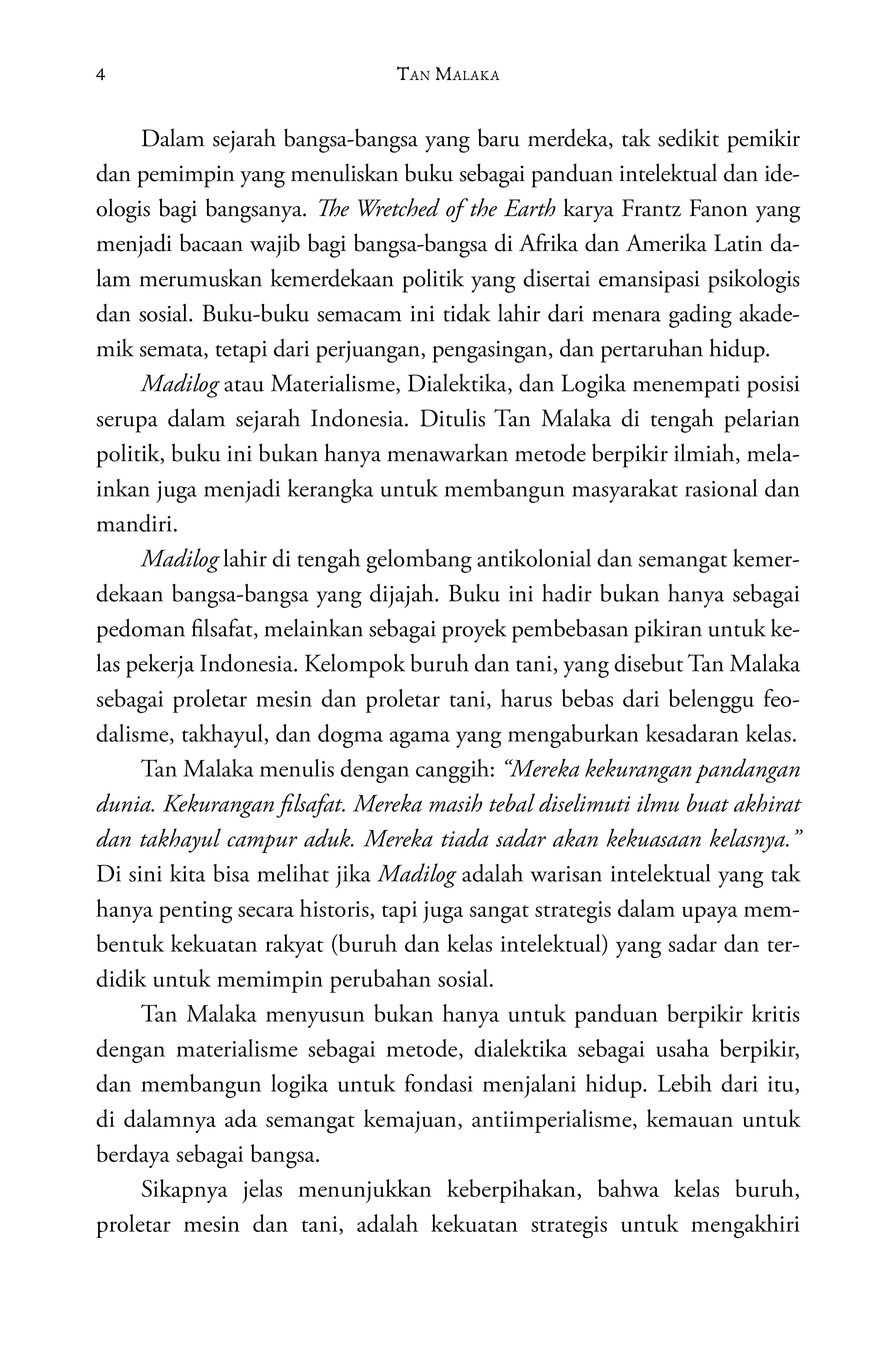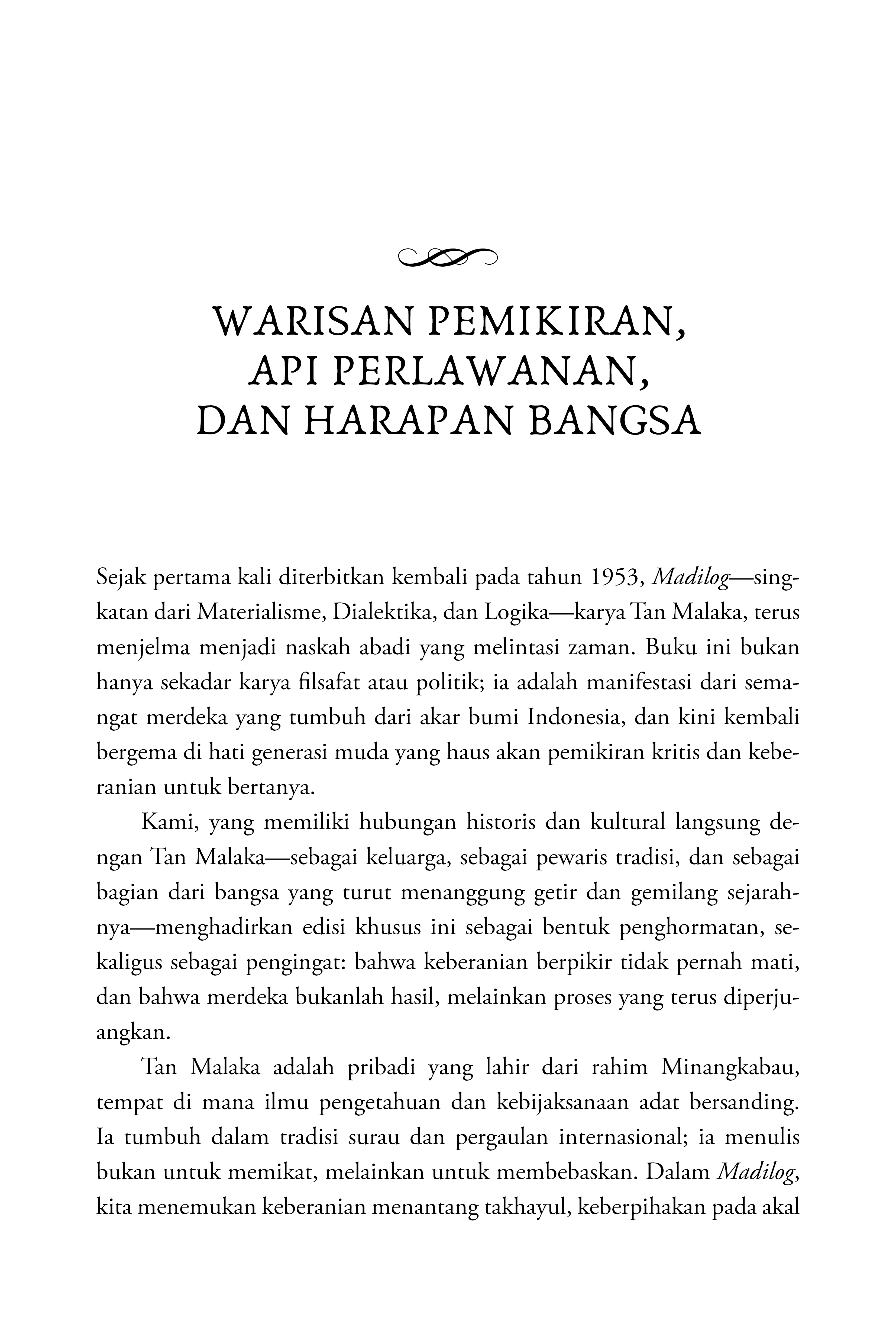 Buku Madilog karya Tan Malaka merupakan salah satu karya pemikiran terbesar dalam sejarah intelektual Indonesia. Mengusung tema Materialisme, Dialektika, dan Logika, buku ini bukan hanya sekadar bacaan filosofis, tetapi juga ajakan untuk membangun cara berpikir yang kritis, sistematis, dan membumi. Bagi siapa pun yang ingin memperdalam wawasan tentang filsafat, ilmu sosial, serta dasar-dasar berpikir rasional dalam menghadapi realitas bangsa, Madilog adalah bacaan yang wajib dimiliki. Buku ini sangat relevan, baik bagi pelajar, mahasiswa, akademisi, maupun siapa saja yang peduli pada perubahan sosial dan kemajuan pemikiran bangsa.