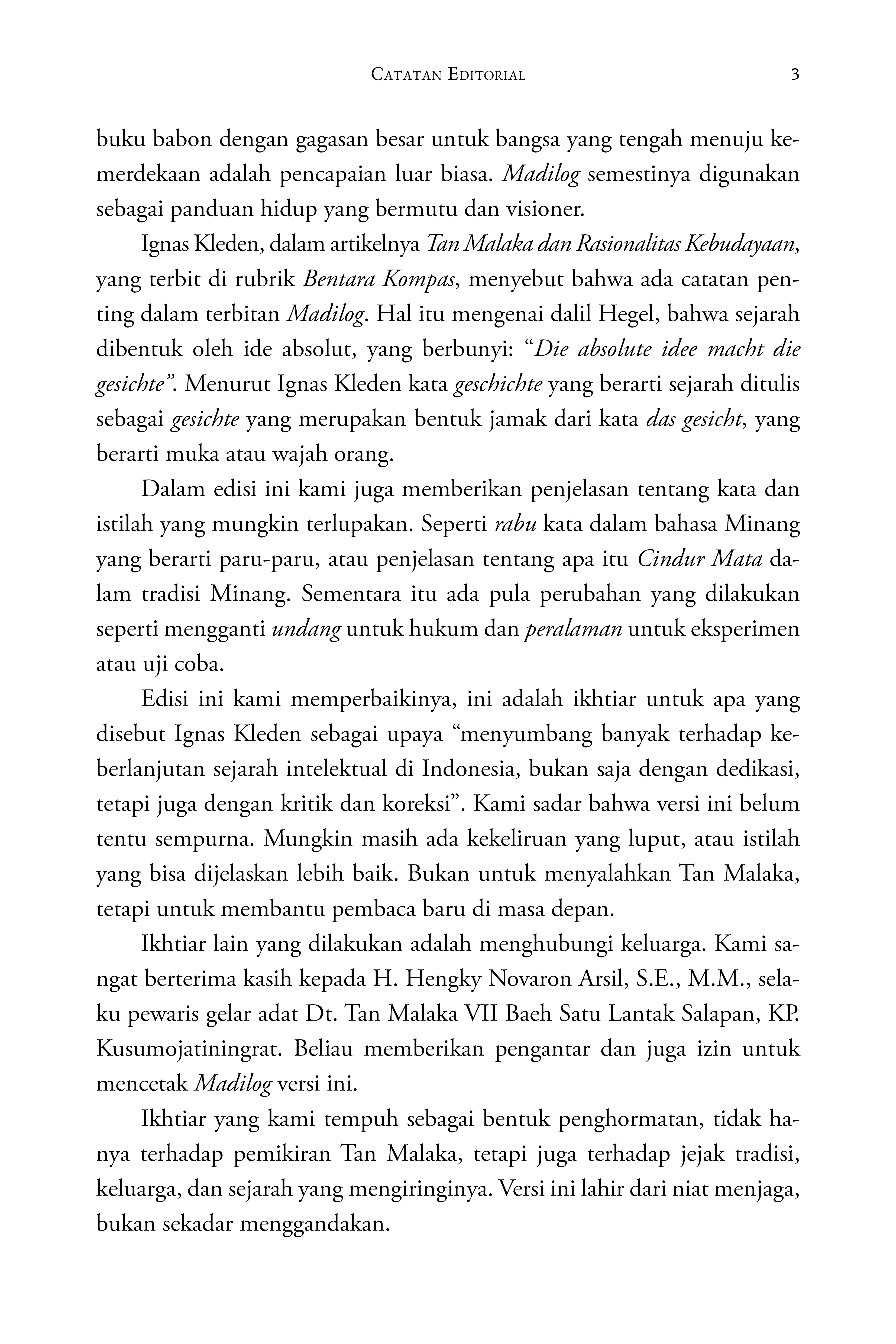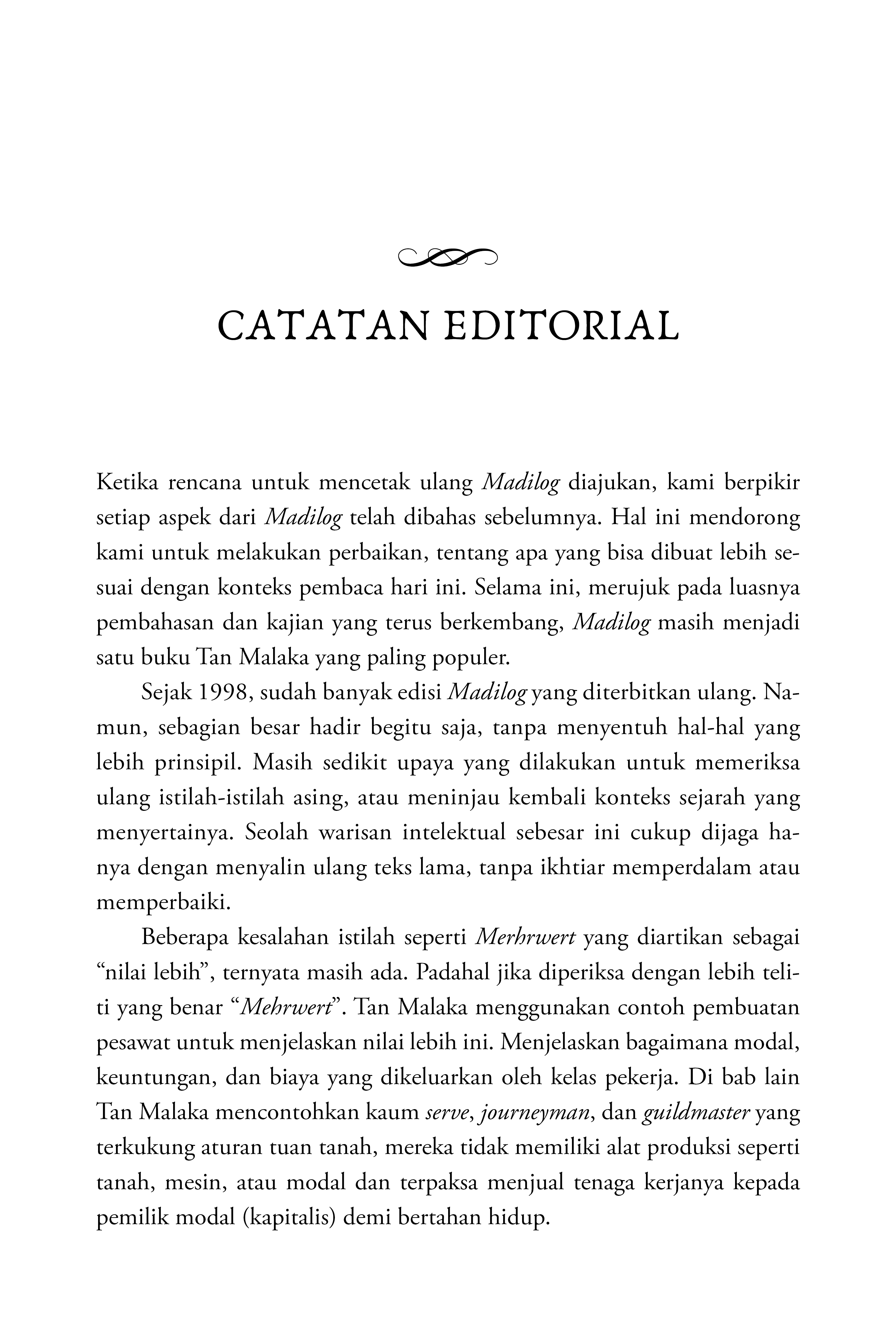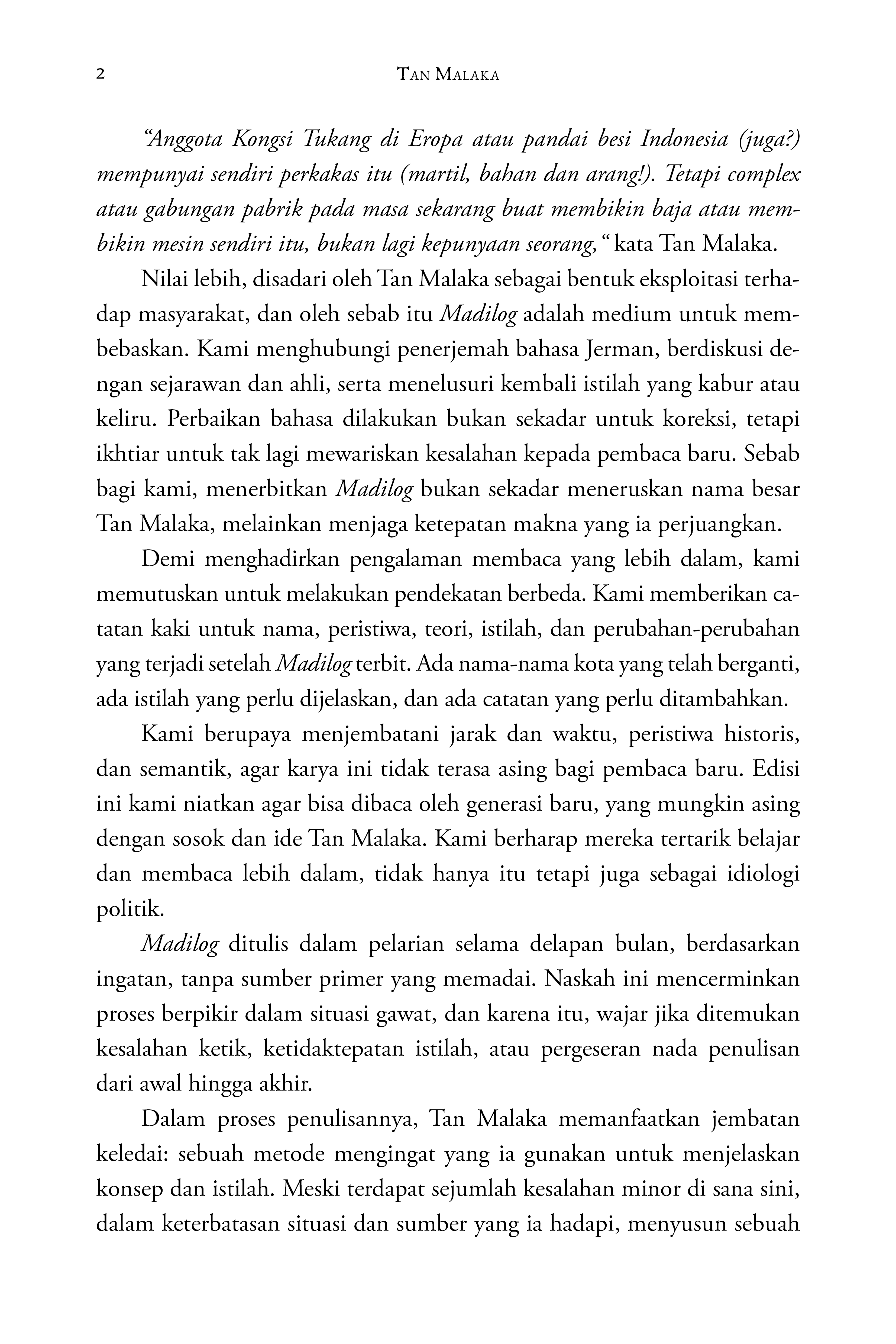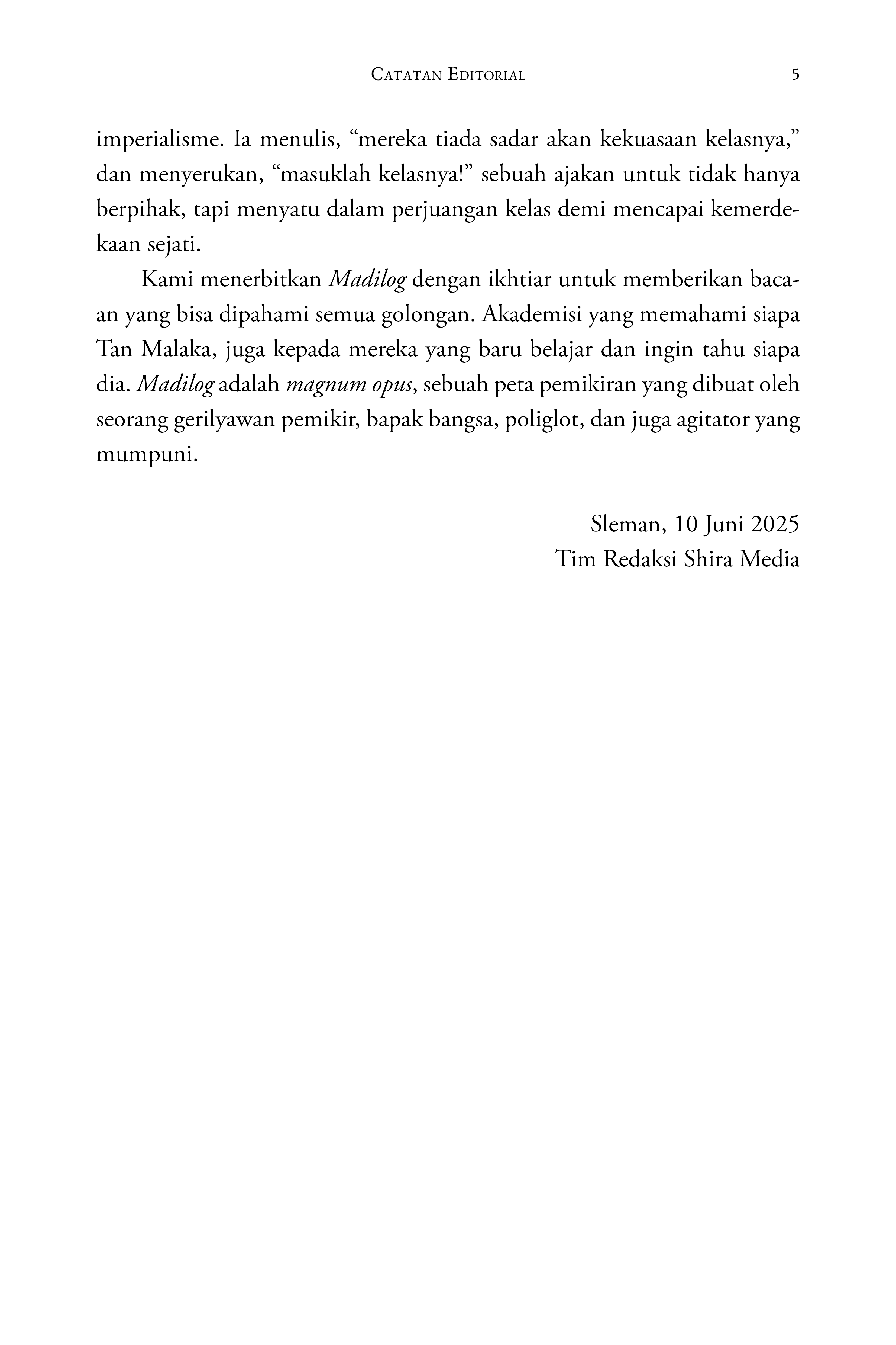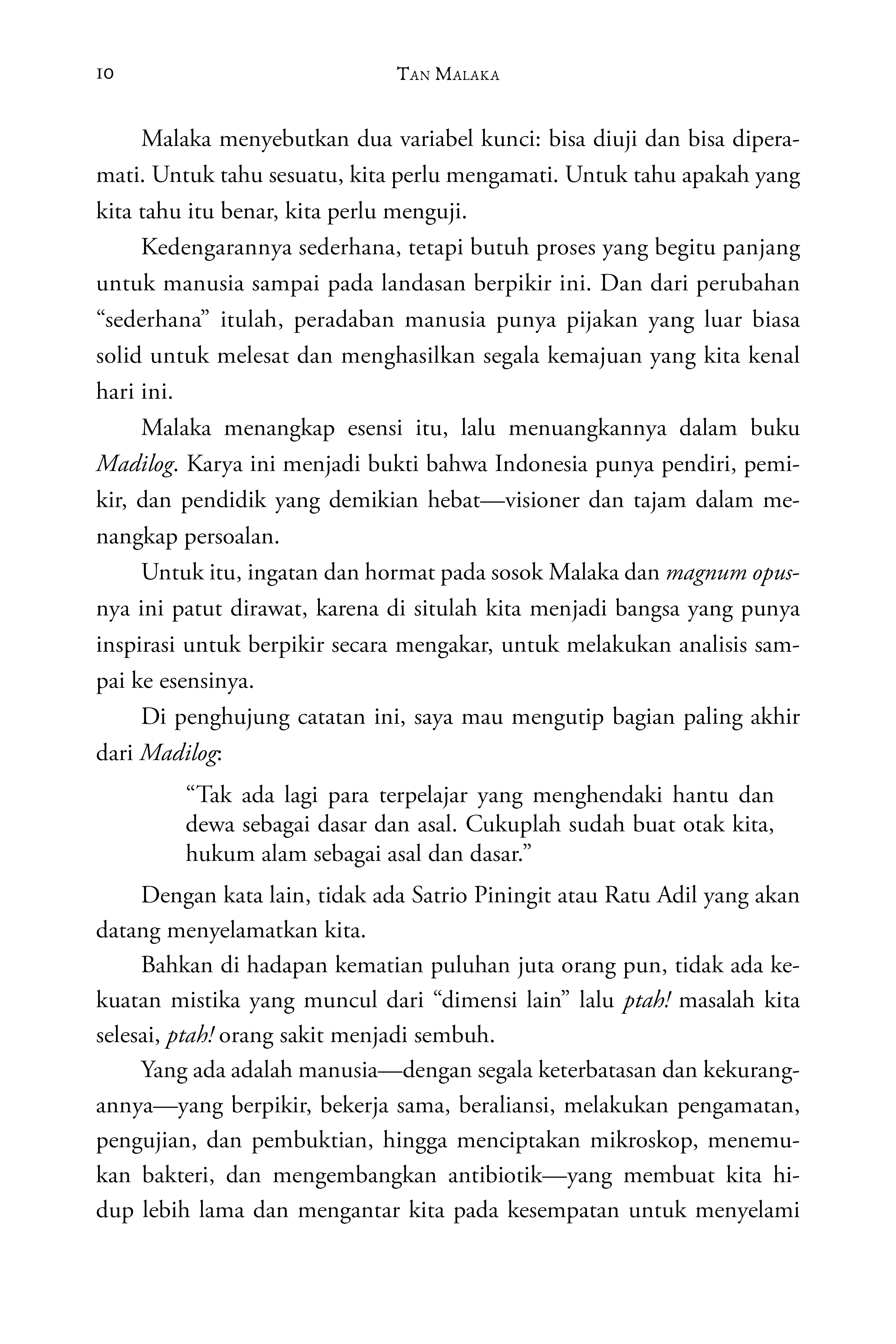 Buku Madilog karya Tan Malaka merupakan salah satu karya pemikiran terbesar dalam sejarah intelektual Indonesia. Mengusung tema Materialisme, Dialektika, dan Logika, buku ini bukan hanya sekadar bacaan filosofis, tetapi juga ajakan untuk membangun cara berpikir yang kritis, sistematis, dan membumi. Bagi siapa pun yang ingin memperdalam wawasan tentang filsafat, ilmu sosial, serta dasar-dasar berpikir rasional dalam menghadapi realitas bangsa, Madilog adalah bacaan yang wajib dimiliki. Buku ini sangat relevan, baik bagi pelajar, mahasiswa, akademisi, maupun siapa saja yang peduli pada perubahan sosial dan kemajuan pemikiran bangsa.